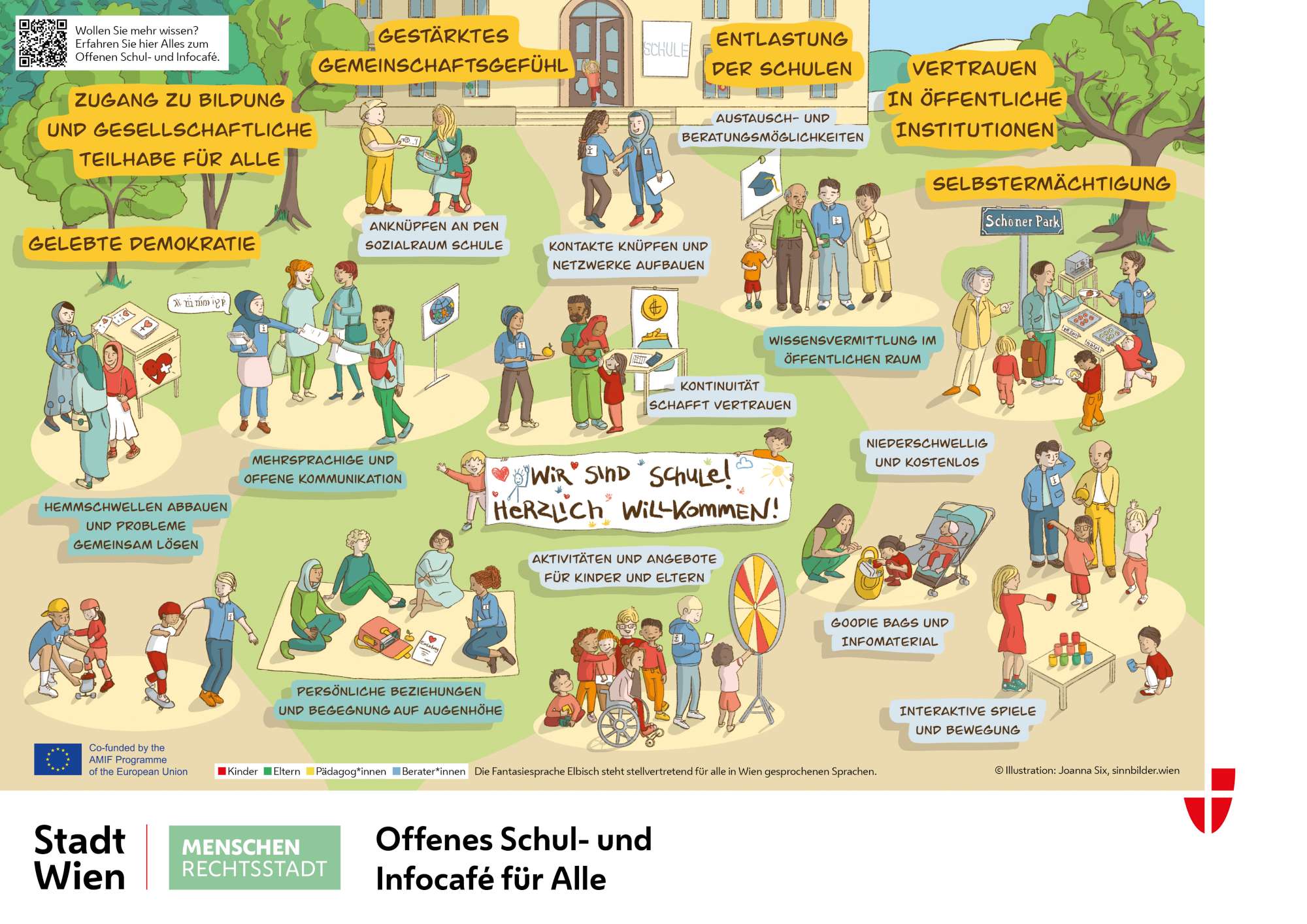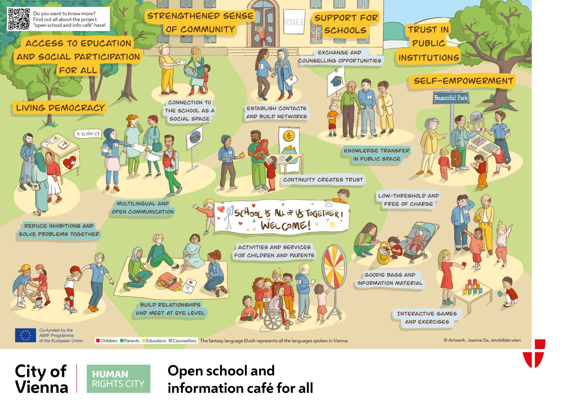 Das offene Schul- und Info-Café wurde als mobiles Unterhaltungs-, Beratungs- und Informationsangebot im öffentlichen Raum für Kinder und Erwachsene konzipiert. Ziel des Pilotprojekts war es, im Rahmen eines niederschwelligen Formats die Schulgemeinschaft zu stärken und das Vertrauen in öffentliche Institutionen zu festigen. Planung und Projektierung erfolgte durch das Menschenrechtsbüro in Form eines von drei Pilotprojekten der Dialogwerkstatt im Jahr 2023. (https://www.wien.gv.at/menschen/integration/menschenrechtsstadt/dialogwerkstatt-pilotprojekte.html)